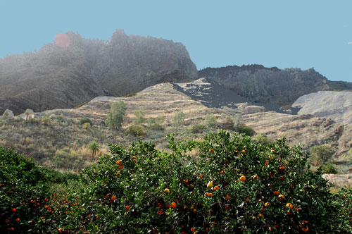 Estamos inmersos en uno de los paisajes más emblemáticos de las islas, unos perfiles de montañas que son cuna de muchas tradiciones y estamos en enero con una temperatura primaveral. En verano pueden llegar hasta los 50 grados. Terrible para la viña.