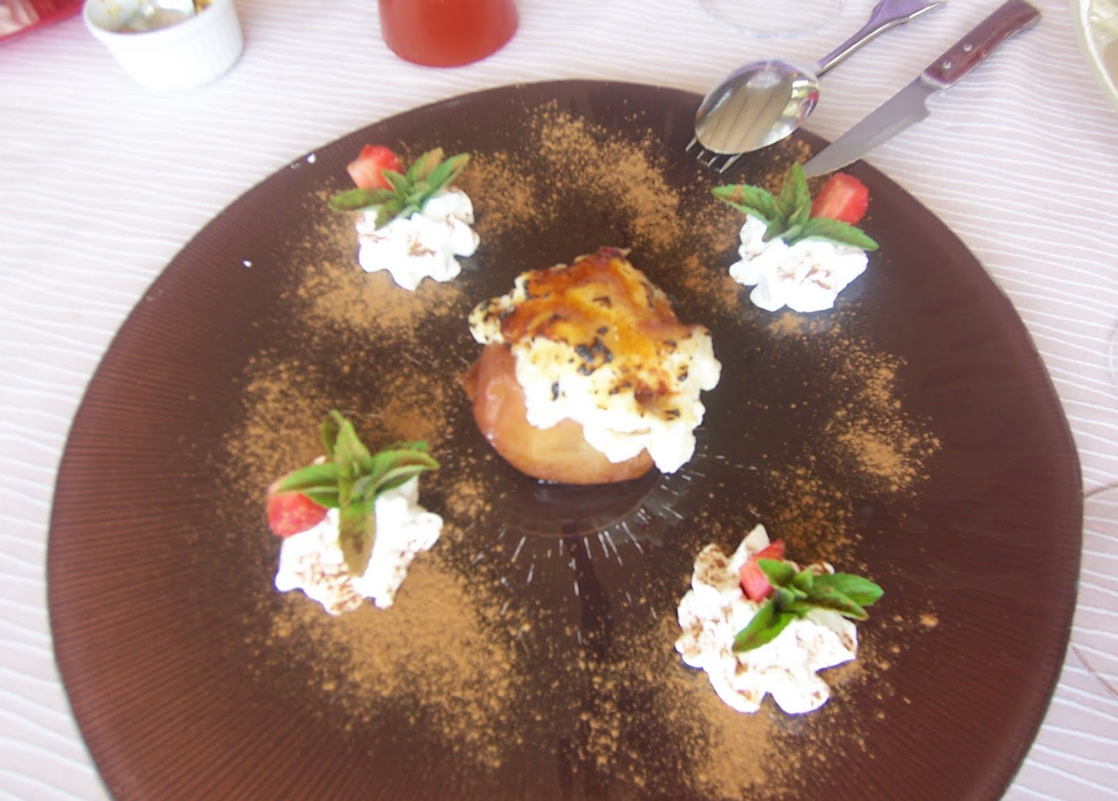 Como el pronombre “pre” dejaba entrever, a continuación entraron en escena los postres, compuestos por unos generosos platos individuales surtidos de una fabulosa tarta de mouse de chocolate negro y de un helado de vainilla sobre bizcocho bañado en leche y canela (rosegons), hermosamente presentados. Al centro se dispuso a su vez una exquisita manzana asada rellena de crema pastelera y nueces, decorada con flores de nata, fresas y hojas de menta.