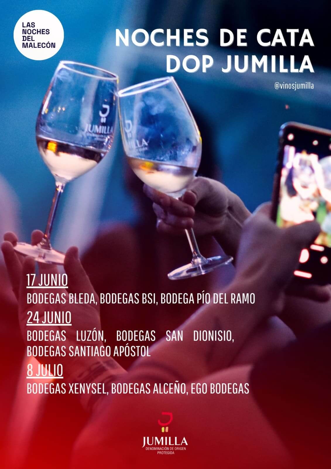 Hoy se inician las catas de vinos DOP Jumilla junto a Las Noches del Malecón, que han podido reunir tres fechas para el disfrute de los amantes del vino este verano, los martes 17, 24 de junio y 8 de julio en el Auditorio Murcia Parque.  Se trata de veladas preparadas con el máximo detalle en las que los amantes del vino y la cultura disfrutan degustando los vinos de la Denominación de Origen más representativa de la Región de Murcia y aprendiendo con sus elaboradores sobre viticultura, elaboración, estilos de vino y filosofía.