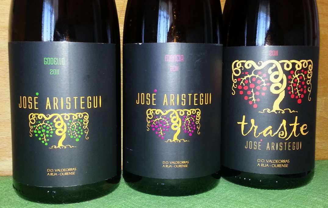 José Arístegui Mencía 2011 (DO Valdeorras, tinto con crianza 100% Mencía, Adega José Arístegui) tiene una producción limitada de 2000 botellas. Vendimia manual, selección de racimos, maceración en frío entre 4 y 5 días, fermentación en inox con control de temperatura, maloláctica en cubas de roble francés y crianza de unos 3 a 5 meses en cuba de roble y barricas de 400 litros. El resultado es un vino de color rojo cereza apicotado con ribete amoratado. Nariz de buena intensidad y franqueza, fruta muy madura, dulzona, notas como de cacao, muy floral y con un indudable olor a campo. En boca se mostró fresco, frutal, de buena acidez y con un tanino muy dulce. De beberse copa tras copa. Buen Mencía.