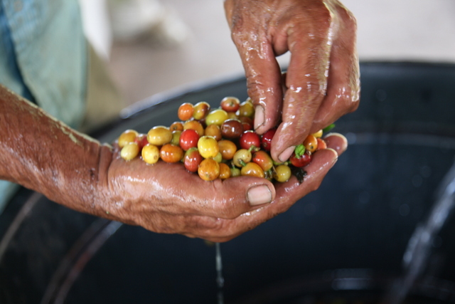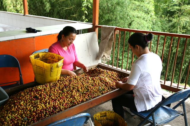 Los trabajadores van llegando al espacio de medida donde se lava la cereza, una vez medida y pasa a las mesas de selección en las que algunas mujeres separan los granos sobremaduros o de mala calidad que se desechan, llevando a la tolva solamente los frutos excelentes.