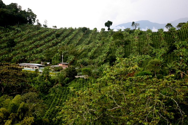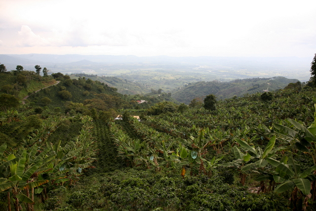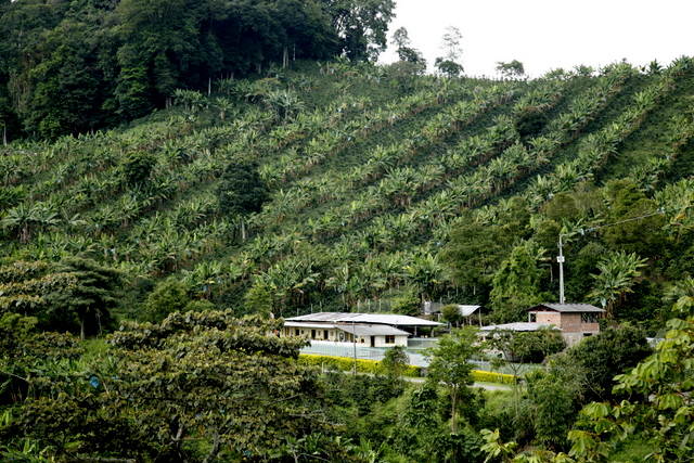 En Rio Verde abandonamos el río, después de pasar por Barcelona, donde hacen una excelente lechona, plato típico local. Comenzamos a ascender hacia Buenavista donde desde la plaza local ya vemos los empinados cultivos de café.