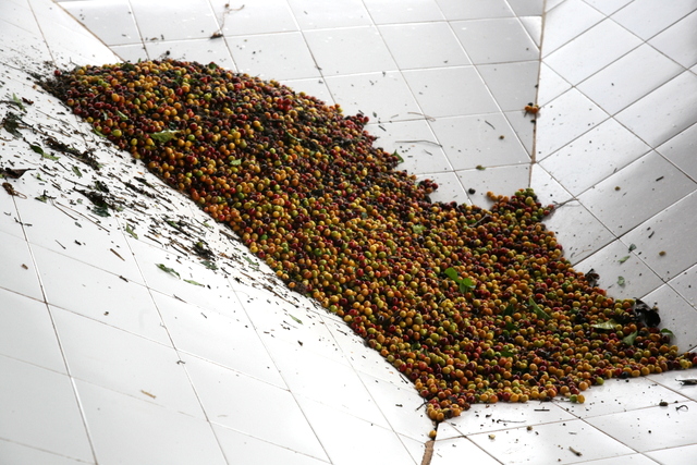 Comenzamos recorriendo la finca y nos van explicando las formas de plantación, las variedades, las maneras de podar el árbol, hoy y ayer. A nuestro lado pasan recolectores silenciosos que cargan el pesado fruto de su trabajo. Tarea delicada la de recoger, las “cerezas” maduras, rojas o las amarillas, que comienzan a tornarse hacia aquel color.