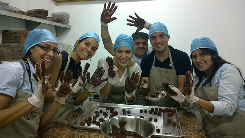 Y así fue como terminé haciendo un tour por sus pequeñas pero genialmente acondicionadas instalaciones, viendo todo el material que utilizan para hacer sus famosos bombones, hablando de tipos de cacao (Criollo, Trinitario y Forastero), su historia, las zonas del mundo donde se cultiva (incluyendo a mi querida Venezuela), sus métodos de producción y procesamiento, entre otras muchas cosas. Sin embargo, el clímax llegó cuando se sacó una Ganache caliente y el grupo comenzó a hacer trufas como una línea de producción bastante bien guiada por su maestro chocolatero Ricardo Baquero y su Sous-Chef Daniel A. Secas.