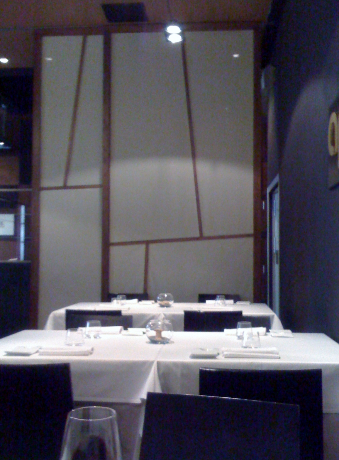 Las mesas, sobria y elegantemente vestidas de mantelería de hilo blanco, contrastaban con los paneles de madera noble que, junto los que se inspiraban en pantallas japonesas, convertían la sala en una suerte de reservados en los que poder disfrutar de una sensación de intimidad y privacidad sin aislamiento