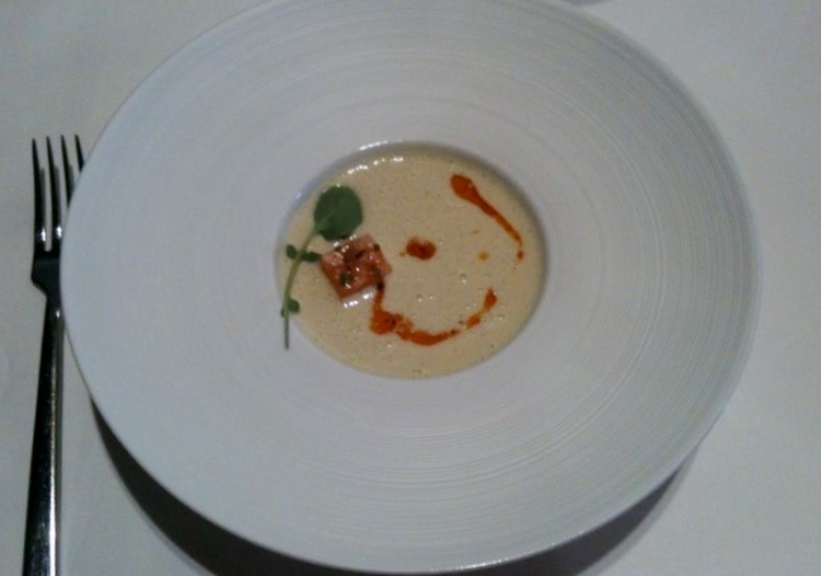 Vichyçots: con Salmón y Aceite de Ñoras: Untuosa, sabrosa y fina crema de calçots, bien contrastada con el taquito de salmón
