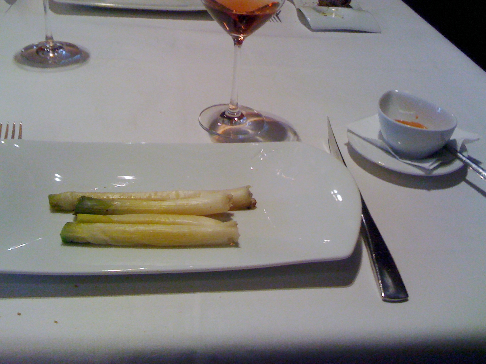 Tras un repaso exhaustivo de la carta, decidimos finalmente hacer caso de sus recomendaciones y pedimos un Cava Gramona Rosado Pinot Noir que acompañó con elegancia y un sutil punto afrutado, todas y cada una de las caras del calçot que nos fueron presentadas y que a continuación detallo: