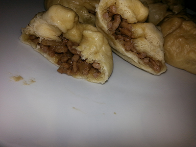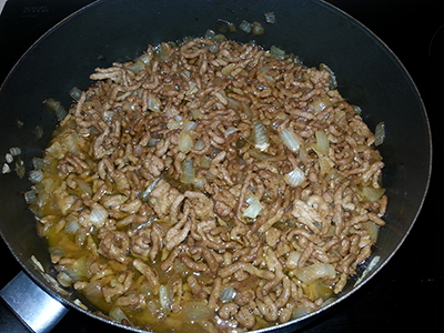 Cortamos la cebolla en taquitos muy pequeños (nos vendrá muy bien a la hora de colocarlo dentro de la masa), cuando veamos que está dorada añadimos la carne picada y removemos para que todos los trozos se suelten. Una vez veamos que la carne está ya (pero no dorada) echamos un chorrito de soja (que bañe la carne) y otro de vinagre. Aunque aquí ya va al gusto de cada uno. Yo utilicé la misma cantidad para ambos.