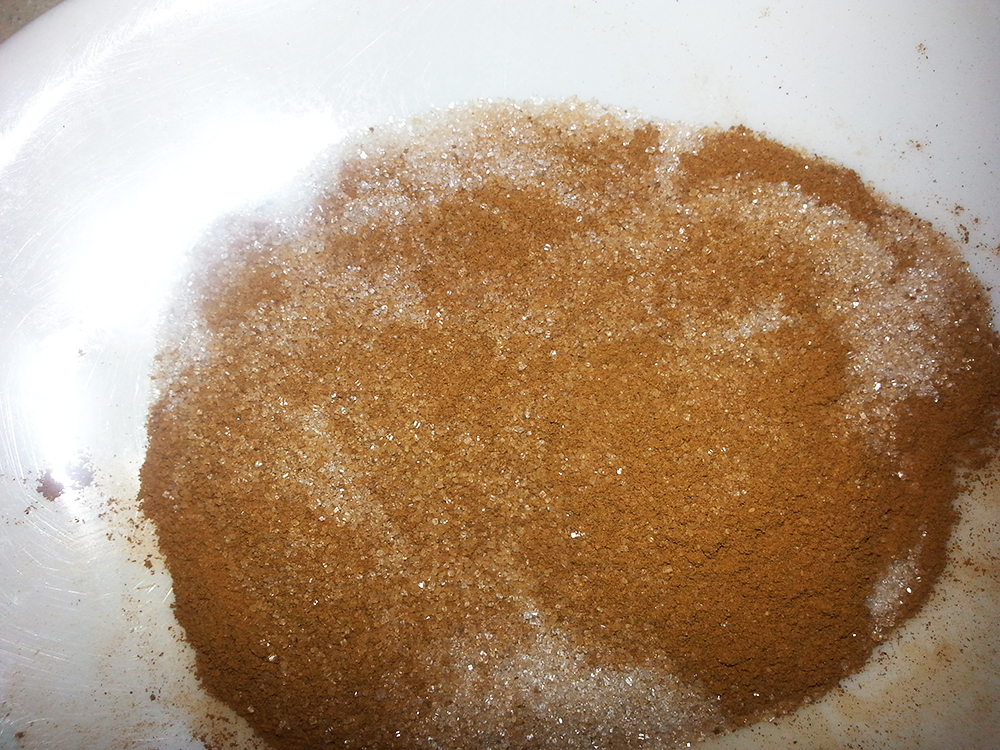 Una vez ya tenemos todos los trozos, en un plato aparte colocamos azúcar y canela (a gusto del cocinero, yo prefiero más canela) y volvemos a rebozar cada pieza hasta que queden bien cubiertas por todos los lados.
