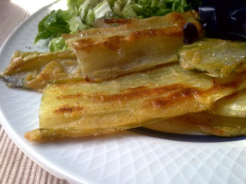 Colar las pencas y secarlas con papel de cocina. Después calentar en una sartén aceite, pasar las pencas por harina y huevo batido. Freír hasta que queden doradas y sacar del fuego, y ya están listas para comer.
