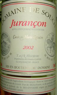 Acabamos con lo mejor de la noche. Un Jurançon dulce del Domaine de Souch, la Cuvée Marie Kattalin, del 2002. mmm! No me canso de los dulces de Petit Manseng y este vino de la biodinámica Yvonne Hégoburu es un gran ejemplo. Color oro viejo brillante. En nariz es intenso, donde encontramos notas de miel, orejones y frutas escarchadas, especias, flores blancas y alguna nota ahumada que me recuerda al pedernal. En boca se bebe con frescura, buena mineralidad y azúcar muy bien integrado con esa acidez característica de estos vinos de las primeras laderas de los Pirineos. Es largo e invita a repetir. Delicioso.