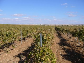 Allí pudimos ver en primer lugar sus viñedos, dispuestos junto a la bodega al más puro estilo de un “Chateau” Bordelés. Son viñas jóvenes excelentemente tratadas y de un aspecto formidable. Las variedades plantadas son Tempranillo, Cabernet, Syrah y Merlot en tintos y Sauvignon blanc en blancos. Posteriormente visitamos la bodega, una obra espectacular que surge de la nada en medio de la llanura manchega.