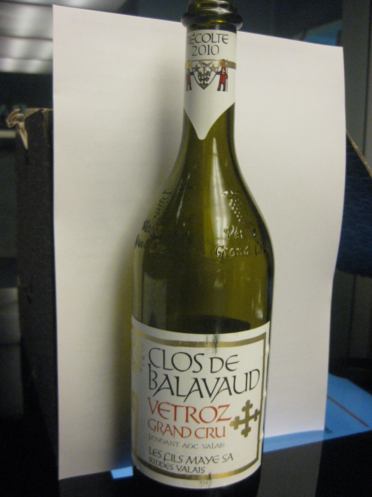 Fendant Clos de Balavaud, Vétroz Grand Cru 2010, amarillo pajizo, nariz más expresiva que el anterior, fruta algo madura, paso elegante y con un posgusto largo dejando sensaciones a sugus de piña. Es un vino indicado para raclettes y fondues. Decir también, que la Fendant es la Chasselas de Valais, es la misma variedad.