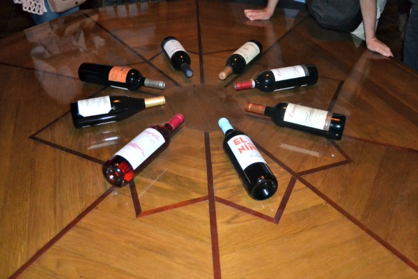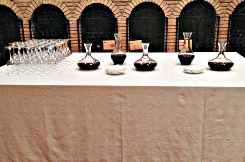 Seguimos avanzando por el botellero y llegamos a una zona mixta, botellas (magnums de Finca Cuesta Clara y botelleros privados) y barricas (Reserva Especial y Finca Cuesta Clara). A partir de este momento Roberto Puras le pasa el testigo a Rafael Martínez quien nos guiaría a través de esta interesante cata. El vino había sido previamente extraído de las barricas y primorosamente colocado en decantadores encima de una mesa vestida para la ocasión.