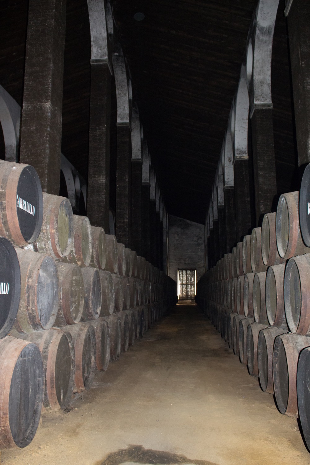 Sin duda el espacio es impactante por sus volúmenes, 100 pilares la sostienen, la bodega más alta de Sanlúcar, nada menos que 12 metros de altura en el centro y una anchura de 33 metros que dan una sensación de majestuosidad a toda la estancia, ese sentimiento de empequeñecimiento similar al que uno tiene en una catedral. Incluso con el pequeño bullicio del grupo, paseando un poco entre las calles, uno se hace idea del silencio y la calma que reina en esta bodega, la sensación de estar ante el colosal dormitorio de estos vinos no menos faraónicos que la obra que los contiene.