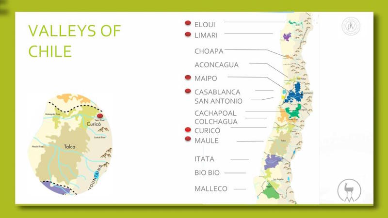 Continuamos con la cata, y con la segunda copa nos trasladamos desde el Penedés hasta Chile, concretamente a la Región del Valle del Maule. Como podéis observar en el mapa de la imagen podemos situar la zona de la cual procede la uva con la que se elabora Estelado Rosé cosecha 2015. Justo aquí está ubicada la Bodega Miguel Torres, en el Valle de Curicó. La Familia Torres posee viñedos en el país chileno desde 1979.