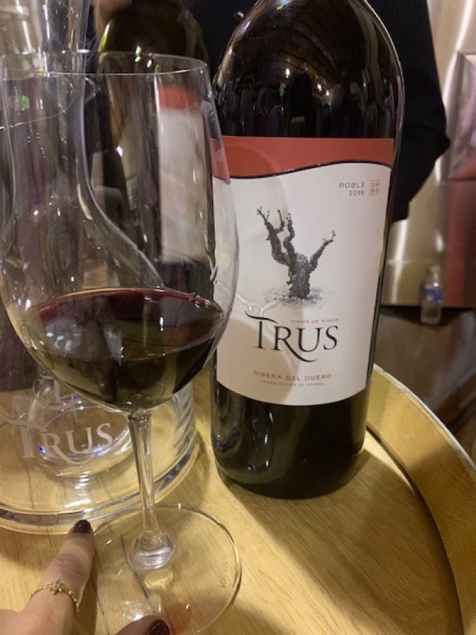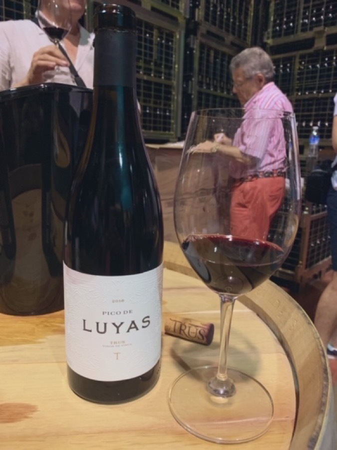 La visita comenzó recorriendo las instalaciones de la bodega mientras podíamos ir catando sus vinos. El primer vino que catamos mientras Rafa, joven enólogo con las ideas muy claras, nos iba contando la historia de la bodega fue Trus Roble 2018, luego pasamos a otra de sus salas de barricas donde catamos su Trus Crianza 2016 mientras seguíamos atendiendo a las explicaciones de Rafa. Para finalizar la cata pasamos a su sala de embotellado y disfrutamos de su Pico de Luyas 2016, el Top de gama de Bodegas Trus.