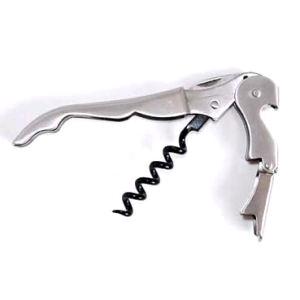 - Sacacorchos de tirabuzón o palanca: Este es de los más famosos, el más utilizado, el que mejor se puede llevar en el bolsillo, el más práctico. Sólo tenemos que clavar el tirabuzón en el corcho e ir enroscándolo, luego apoyamos en el cuello de la botella uno de las partes metálicas y con la otra hacemos palanca para sacar el corcho.