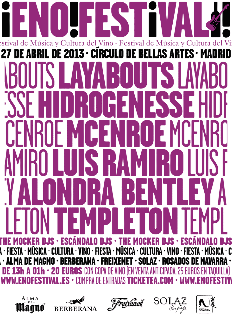 Hidrogenesse, Layabouts, McEnroe, Luis Ramiro, Alondra Bentley y Templeton completan el cartel de esta segunda edición en la que los conciertos se intercalarán con catas de vino y sesiones Djs. Además las bodegas participantes dispondrán de enoBarras en las que servirán sus productos (del vino blanco al tinto pasando por el rosado o los combinados con brandy). Los asistentes también podrán probar el vino en otras de sus facetas como el tinto de verano o el blanco con naranja en la barra "Tómatelo Como Quieras".