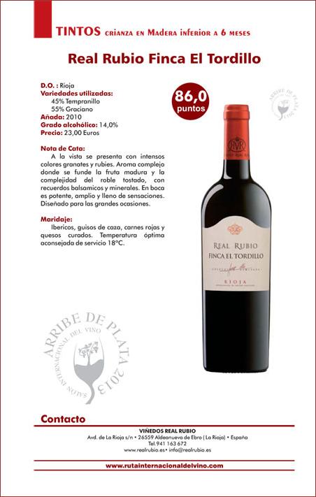 Esperamos que os guste el vino sugerido hoy: un tinto con crianza en madera inferior a 6 meses de la D.O. La Rioja, Real Rubio Finca El Tordillo.