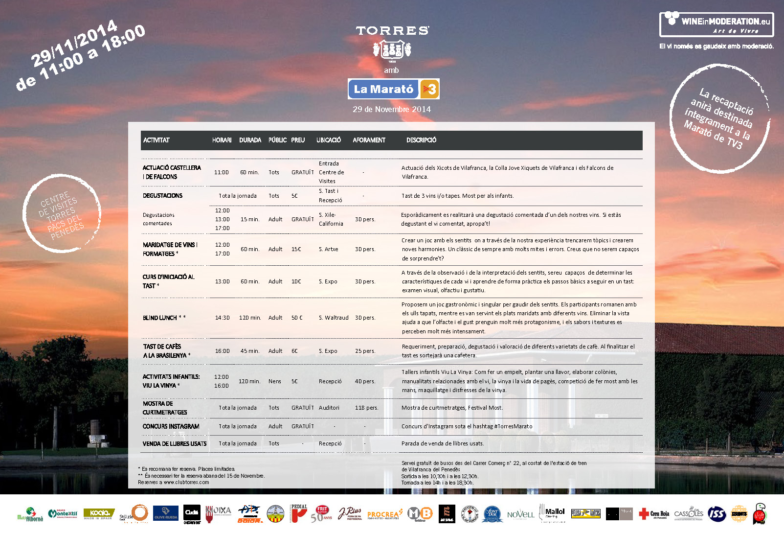 El acceso a las instalaciones es gratuito. Para facilitar el desplazamiento de los visitantes, se habilitará un servicio gratuito de bus desde la estación de Vilafranca (C / Comerç 22) en el Centro de Visitas de Torres en Pacs del Penedès.