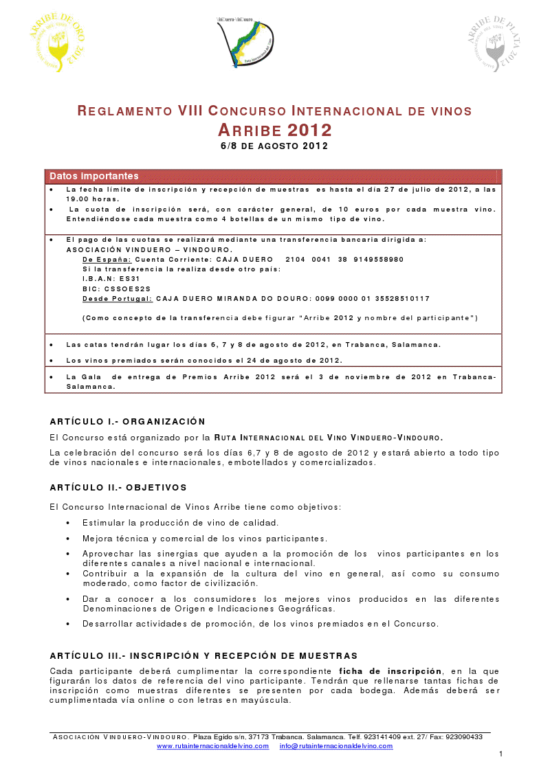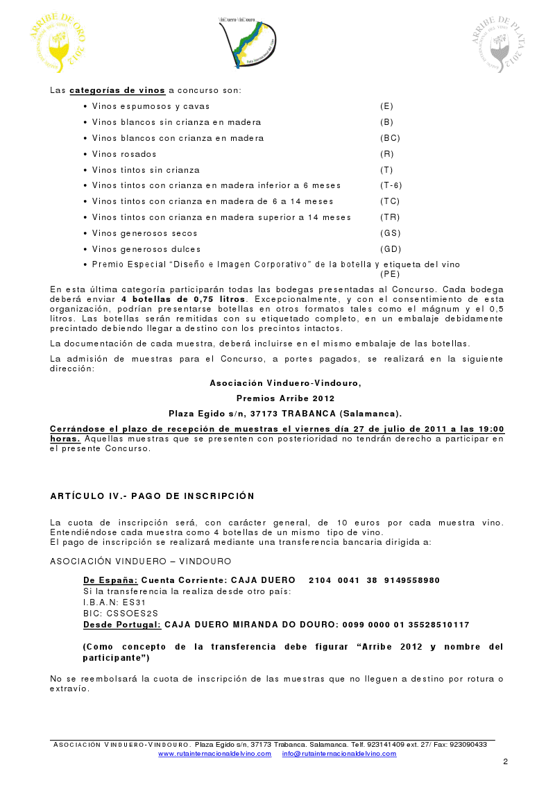 La Ruta Internacional del Vino Vinduero-Vindouro abre hoy el periodo de inscripción para que las bodegas puedan participar en la octava edición de los Premios Arribe.