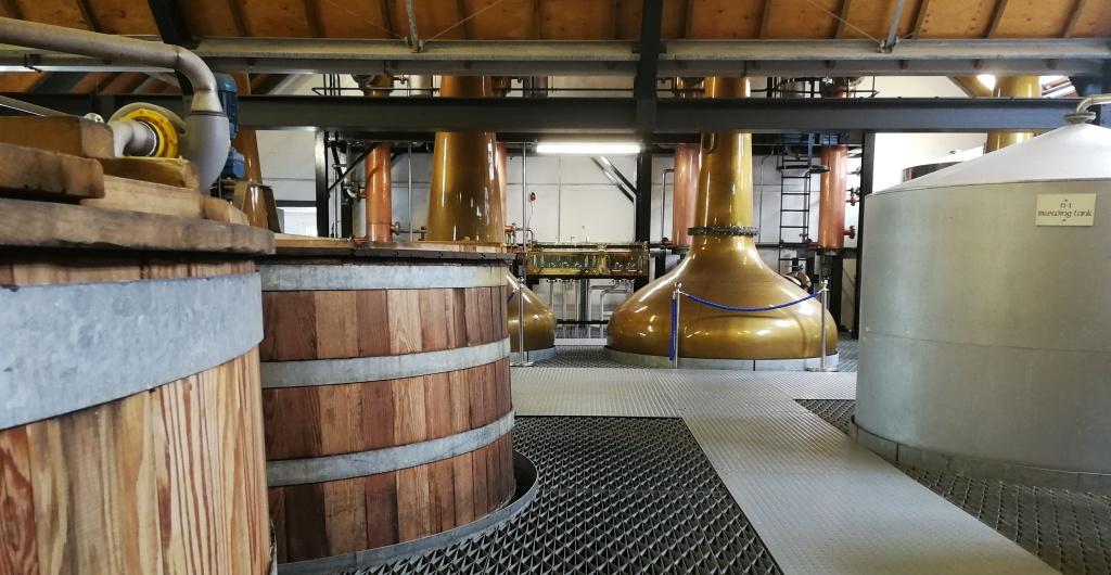 Durante la visita pudimos hacer un recorrido por la historia de la marca y la sala donde están todos los elementos importantes en el proceso de elaboración del destilado: El depósito de mezcla, los tanques de fermentación - de madera - y cuatro alambiques. En el recorrido se destaca la pureza del agua utilizada en todo el proceso.