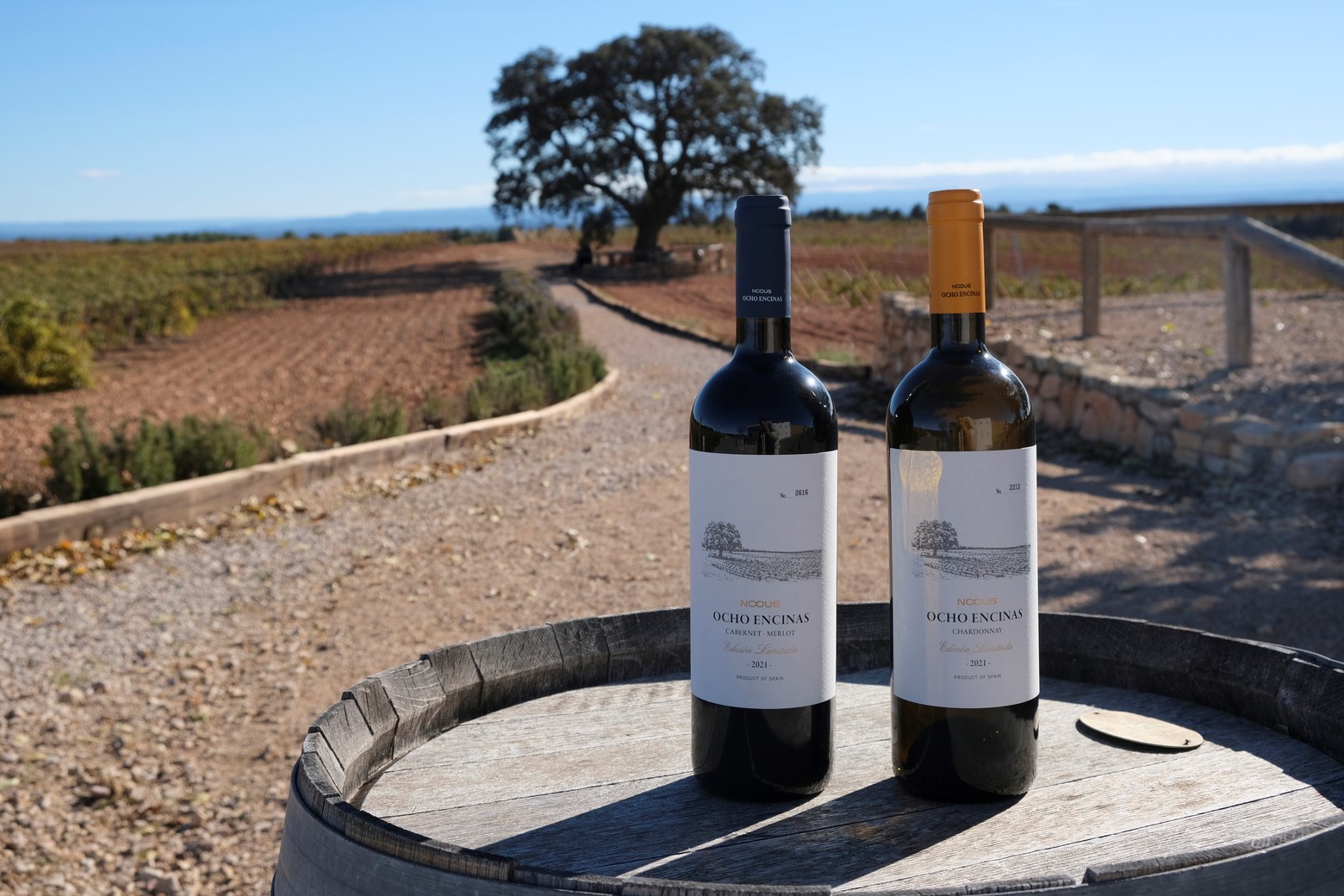 Nodus 8 Encinas Tinto: elaborado con Cabernet Sauvignon y Merlot en viñedos a 800m de altura, estas parcelas tienen una baja producción y las uvas son pequeñas, esto permite tener una mayor concentración y el resultado es un vino con más color, cuerpo y sabor. De color rojo intenso de capa alta y con ribete violáceo. Intensidad aromática alta a frutos negros, notas balsámicas, sotobosque y matices especiados a pimienta negra y clavo. Entrada intensa, gran volumen en boca, aterciopelado y redondo con larga persistencia en boca y equilibrada acidez. Resaltan los tostados de la barrica y el retronasal afrutado.