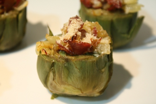 Alcachofa rellena de jamón y cebolla con cumbre de queso