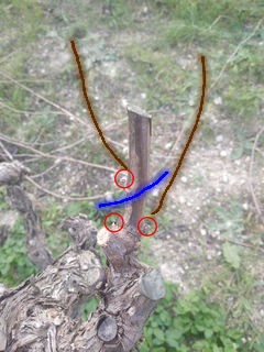 Ver mensaje de VinoibzEn estos casos tuyos, yo haría así (líneas marrones los pámpanos de este año, línea azul corte de la poda del año que viene)