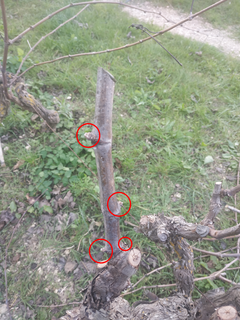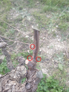 Ver mensaje de VinoibzYo diría que ambos pulgares están bien podados. En la primera quitaría en verde la yema de más abajo, que mira hacia los cortes viejos, y te quedan dos yemas productivas este año, la más baja mirando hacia fuera para seguir el pulgar el año que viene.