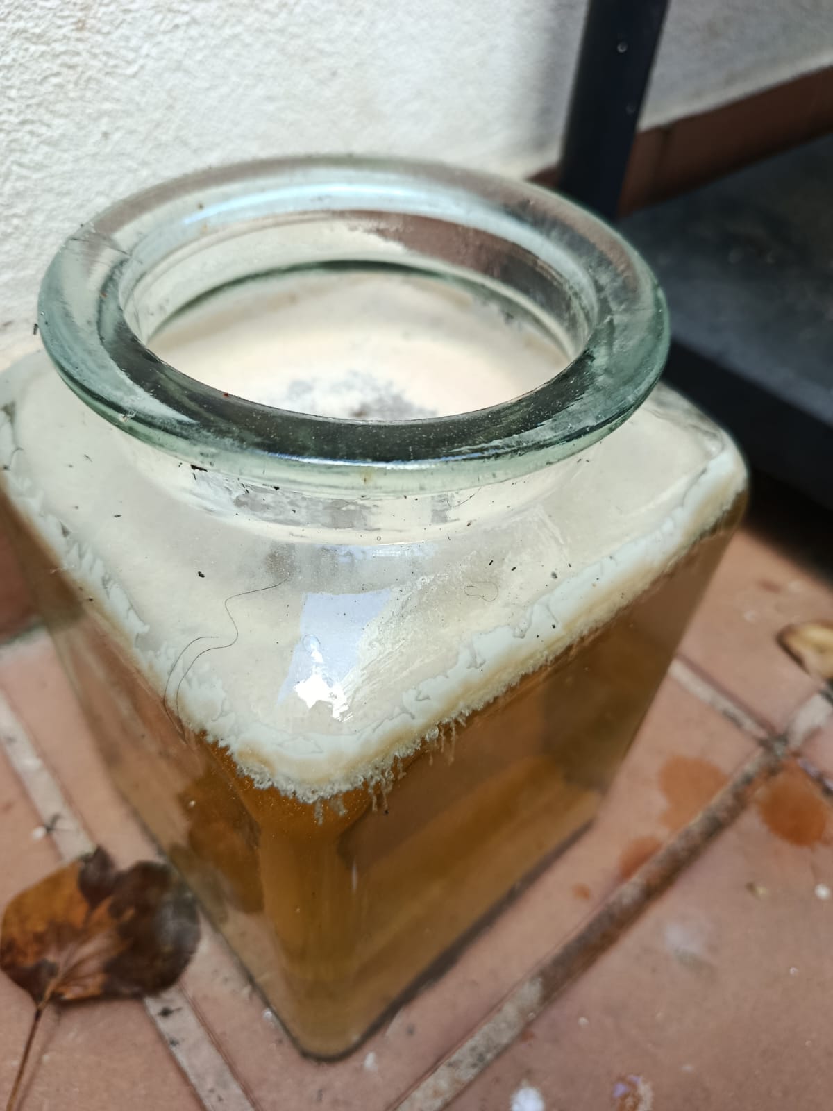 Os cuento las novedades. Después le volvió a salir el velo, más fino que antes, pero pasó una pequeña desgracia y es que se abrió una pequeña grieta en el recipiente y solo pude recuperar litro y medio del vino, así que tuve que comprar otro y lo rellené con este litro y medio salvado y unos tres litros de vino totalmente nuevo, por lo que tuve que comenzar de nuevo la solera. De momento a esta no le ha salido velo de flor.