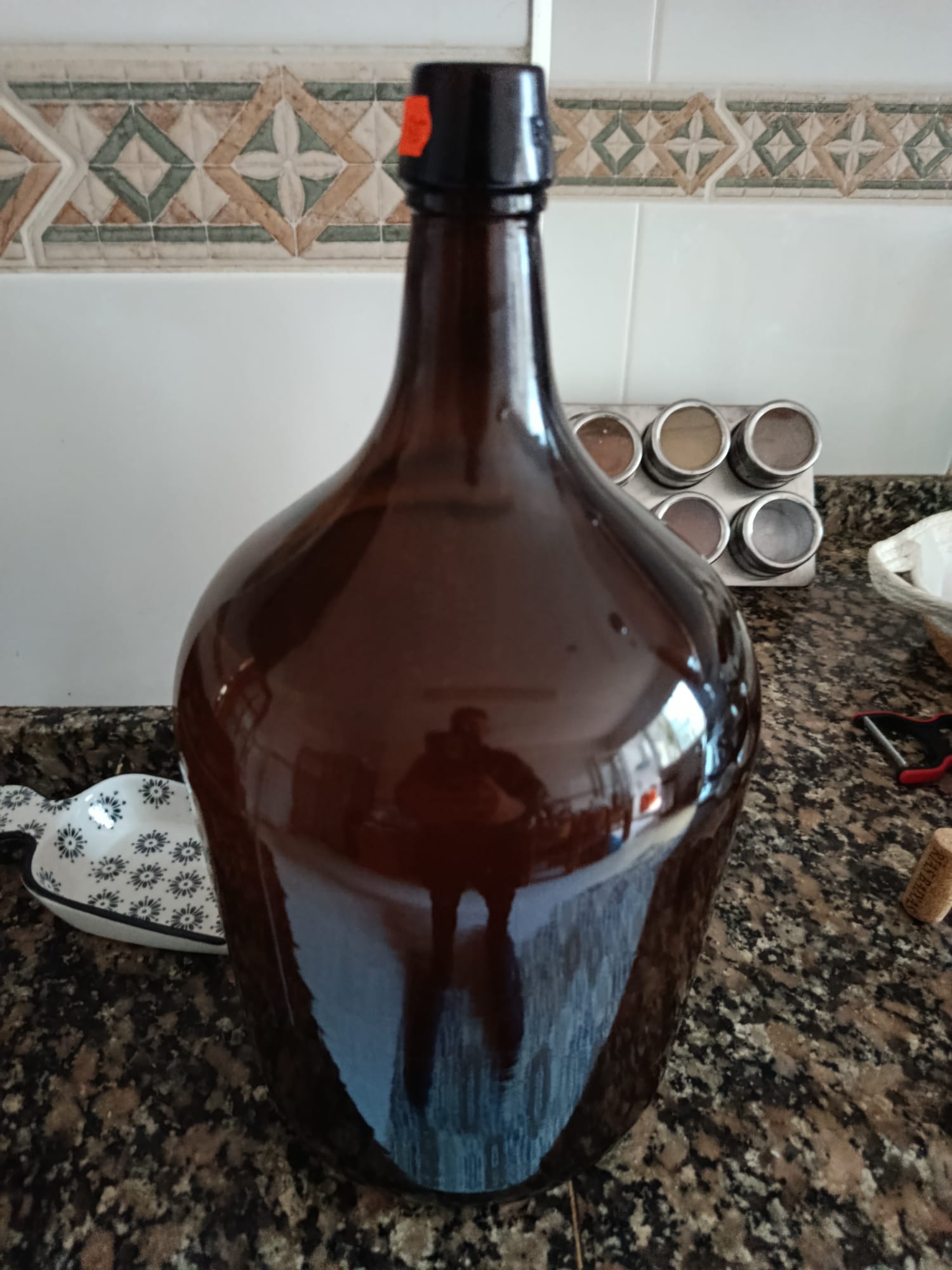 En otra, más pequeña, de unos 3 litros, lleva desde primavera de 2021, primero en una terraza semiabierta y desde 2024 en el mismo patio. Su contenido son distintos riojas blancos secos y semidulces (los dos últimos refrescos los he hecho con el popular Diamante). Sin encabezar.