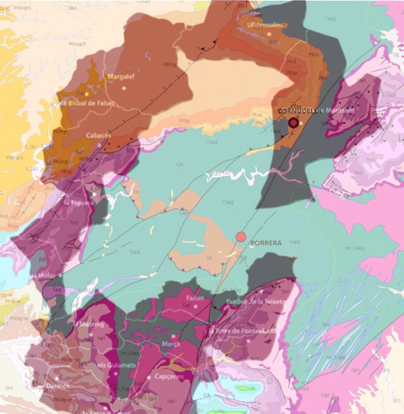 En el mapa geológico se puede ver que Priorat es casi todo verde, eso son greses y pizarras (rocas de matriz ígnea), y estas últimas son las que dan lugar a su suelo característico. En cambio, en la corona de Montsant los colores son básicamente ocres y rojizos, formaciones calcáreas o arcillosas que dan suelos algo más fértiles, aunque eso es bastante relativo, porque la fertilidad depende de muchos factores.