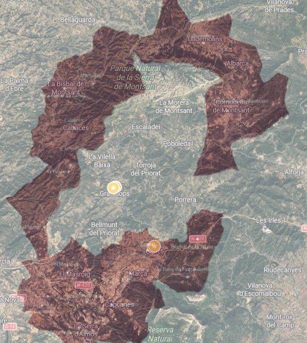 La imagen de satélite la he puesto para que se vea que sobre todo en la parte de Falset / Marçà / Capçanes se ve claramente que hay una superficie cultivada más extensa, posible porque la orografía es más amable, con más llano, lo que hace pensar también en suelos más profundos, menos pobres. En cambio, en el centro de Priorat escasean las áreas cultivables por su rugosidad.