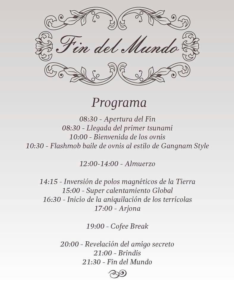 Os paso el programa para el día de hoy, que se acaba el mundo. Habrá que hablar con los mayas, porque se olvidaron de dejar un hueco para la "última cata"