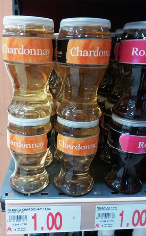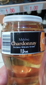 Por si cabe alguna duda, se trata de vino en vaso de plástico (cerrado como un yogur) y con una capacidad de 187 mL. La gama comprende Cabernet sauvignon, Merlot, Chardonnay y rosé, a 1 €. Por supuesto, no busquéis más información de la que se ve en las fotografias.