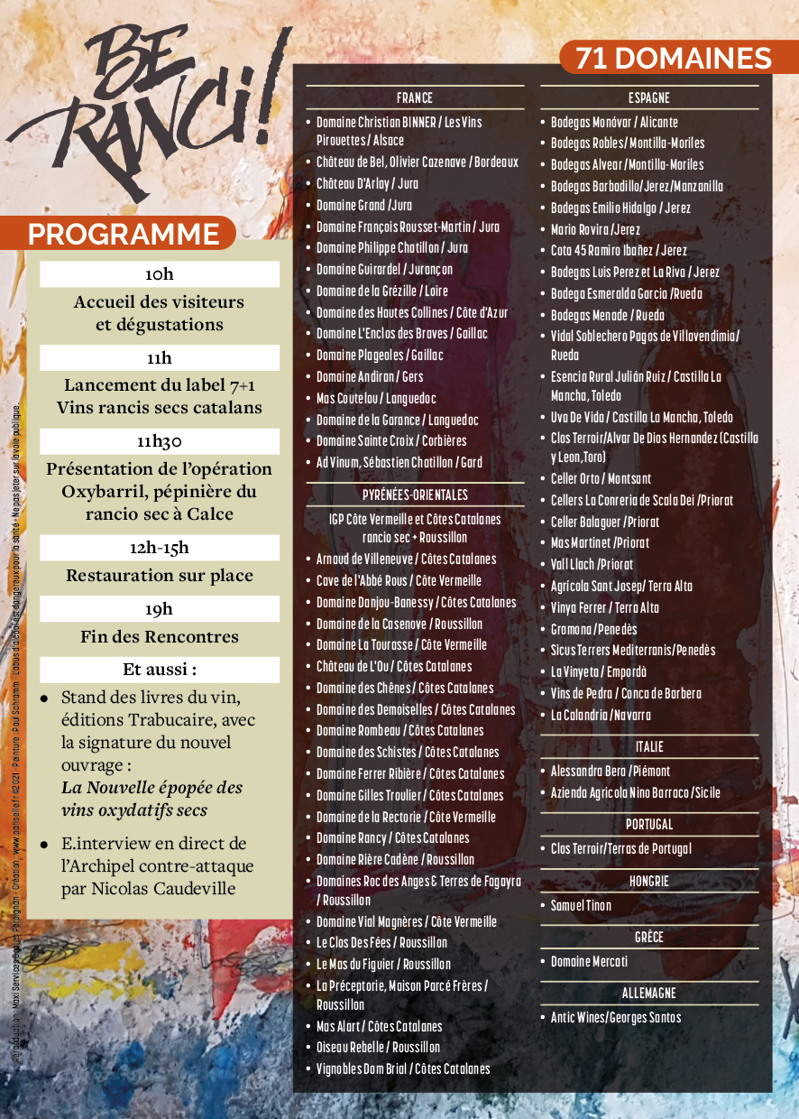 Como buen empordanès, soy súper fan de los vinos oxidativos, así qué el próximo lunes me acercaré a Perpignan donde se celebra una feria de este tipo de vinos. Muchas bodegas de Ruossillon, otras de francia, incluyendo Jura, y también muchos de la península, sobretodo catalanes y del marco de Jerez. Si teneis tiempo y os lo podéis combinar, ya sabéis.