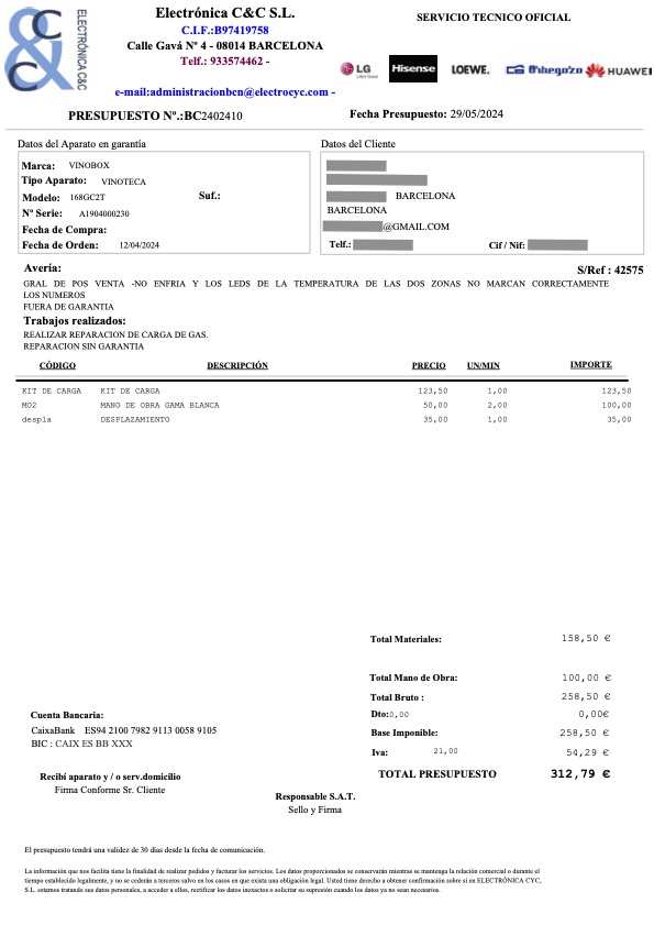 El 22/04/2020 compramos la Vinoteca de doble temperatura Vinobox, en concreto el modelo 168GC 2T de 168 botellas, que justo antes de cumplir los 4 años dejó de funcionar y Vinobox nos dice que no se puede reparar, según su servicio técnico tienen una fuga de gas interna, por lo que ahora es un trozo de chatarra muy grande. A parte de la fuga, los leds de temperatura ya hace tiempo que dejaron de funcionar. Os adjunto el texto literal del presupuesto de reparación de la avería de su servicio técnico: GRAL DE POS VENTA -NO ENFRIA Y LOS LEDS DE LA TEMPERATURA DE LAS DOS ZONAS NO MARCAN CORRECTAMENTE LOS NUMEROS. FUERA DE GARANTIA.