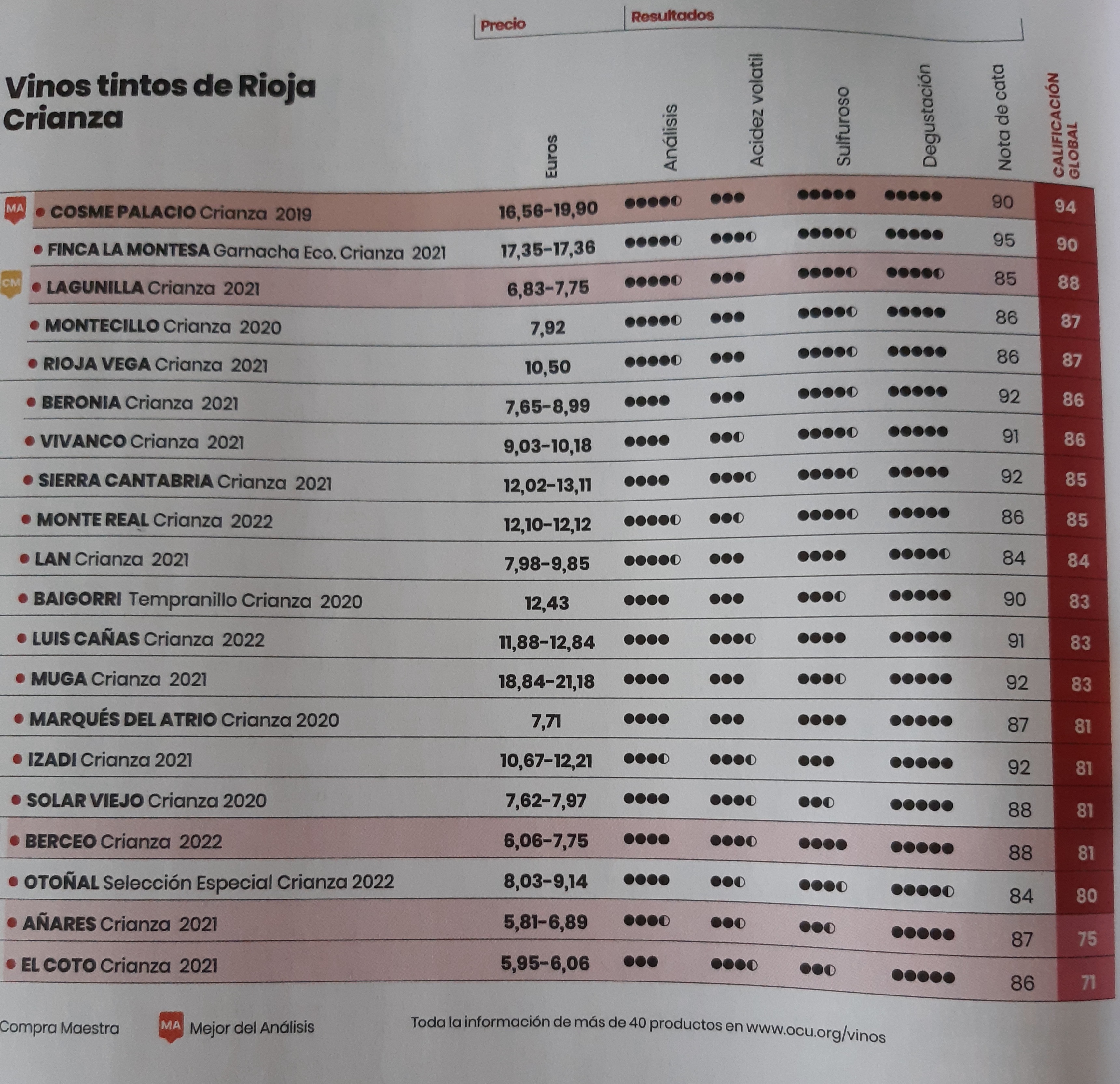 Es que me he comido un poco de la foto, pero señala como El Mejor del Análisis al Cosme Palacio y como Compras Maestras (atendiendo a la Calidad-Precio ó Precio-Placer) el Lagunilla, Berceo, Añares y El Coto. Todos son crianza y de Rioja.
