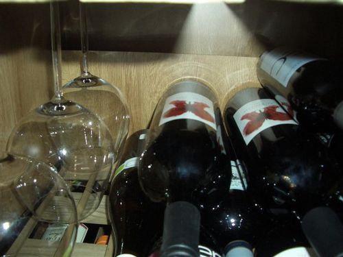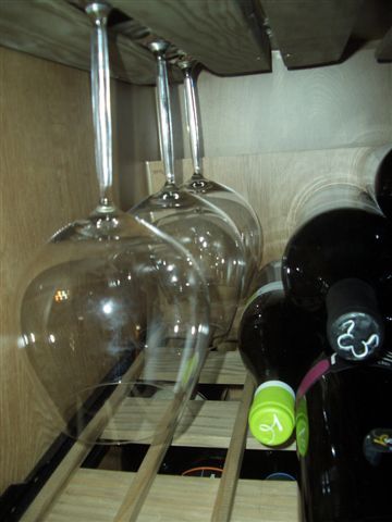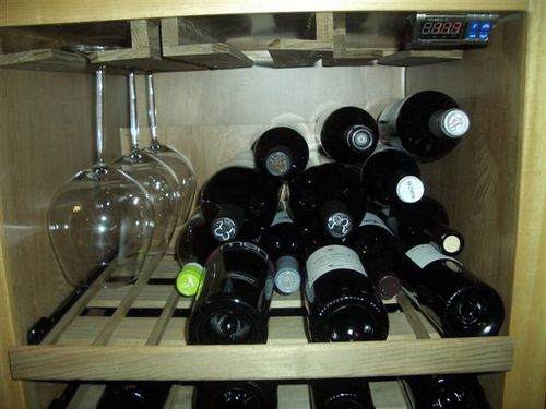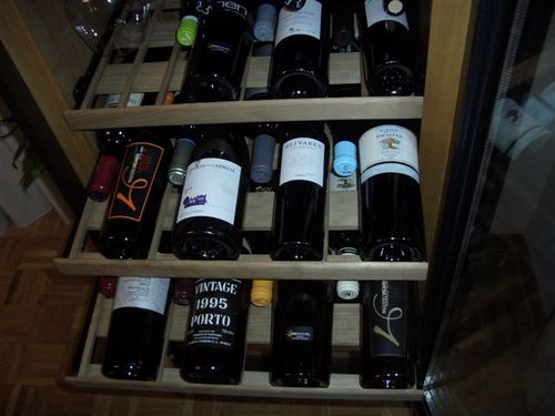 Recuerdo que cuando hablé con los fabricantes, me llamaron para saber cuantas bandejas correderas quería: en principio había encargado la vinoteca con 5, pero me dijeron que en ese caso la capacidad se vería mermada. Te diré que con 3 bandejas correderas llenándola hasta arriba puedo guardar unas 70-80 botellas. En estas bandejas las botellas quedan bien entrelazadas, pero hay ciertas botellas más largas de lo normal que no caben de esta forma y hay que combinarlas con alguna botella pequeña, tipo vino dulce por ejemplo.