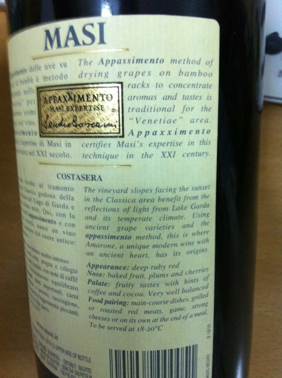 Me he dado una vuelta por el histórico del foro y poco se comenta de este tipo de elaboración. Hoy he abierto una botella de MASI Costasera Amarone Classico 2007. Poderoso color, poderoso en nariz, poderoso en boca. Ese toque más allá de la golosidad le aportan un agradable punto que invita a seguir bebiéndolo. La variedad con la que está elaborado es la corvina, que yo creía que era un pescado, y elaborada con el método del appassimento, que consiste en dejar las uvas deshidratarse al aire libre sobre unas mallas de bambú durante unas semanas, lo que las confieren acidez y ganan dulzor y concentración.Re: Qué es el "appassimento" en vinos