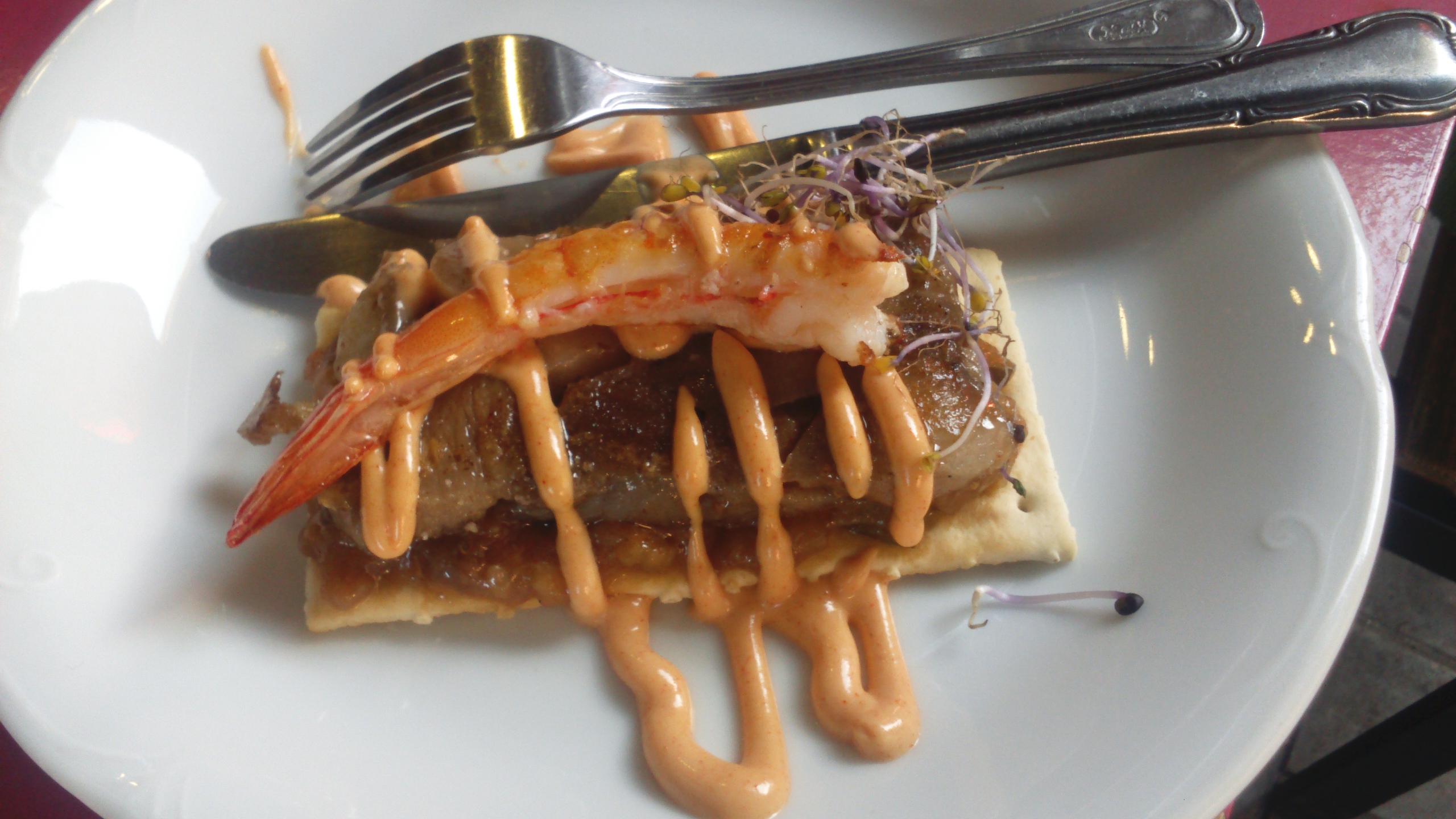 - Montadito de bacalao ahumado con puré de aceituna negra y tocino ibérico al soplete sobre pan de cristal. No necesita más explicación. Además, aquí el ahumado del bacalao y el sopletazo al tocino armonizan muy bien.
