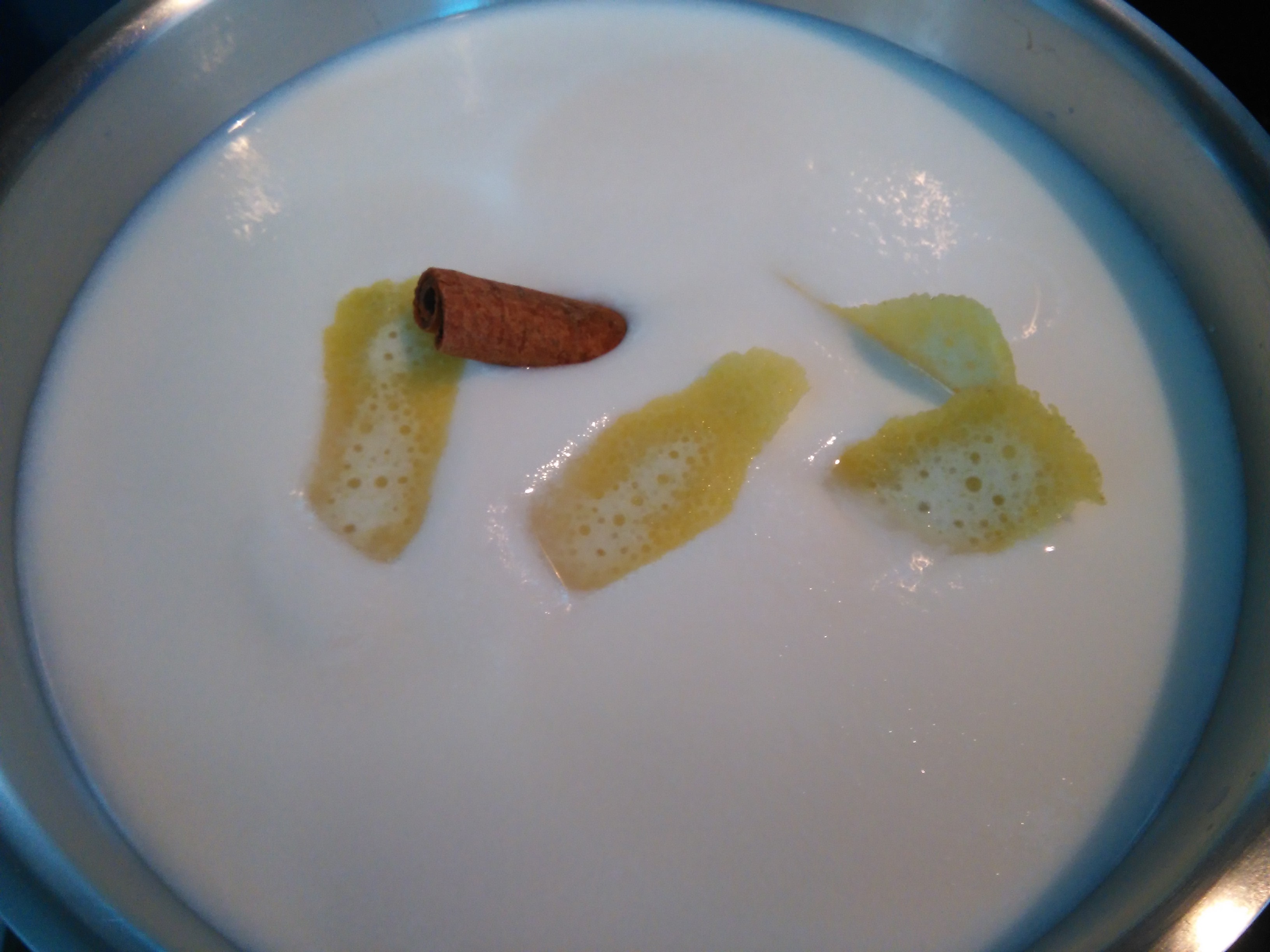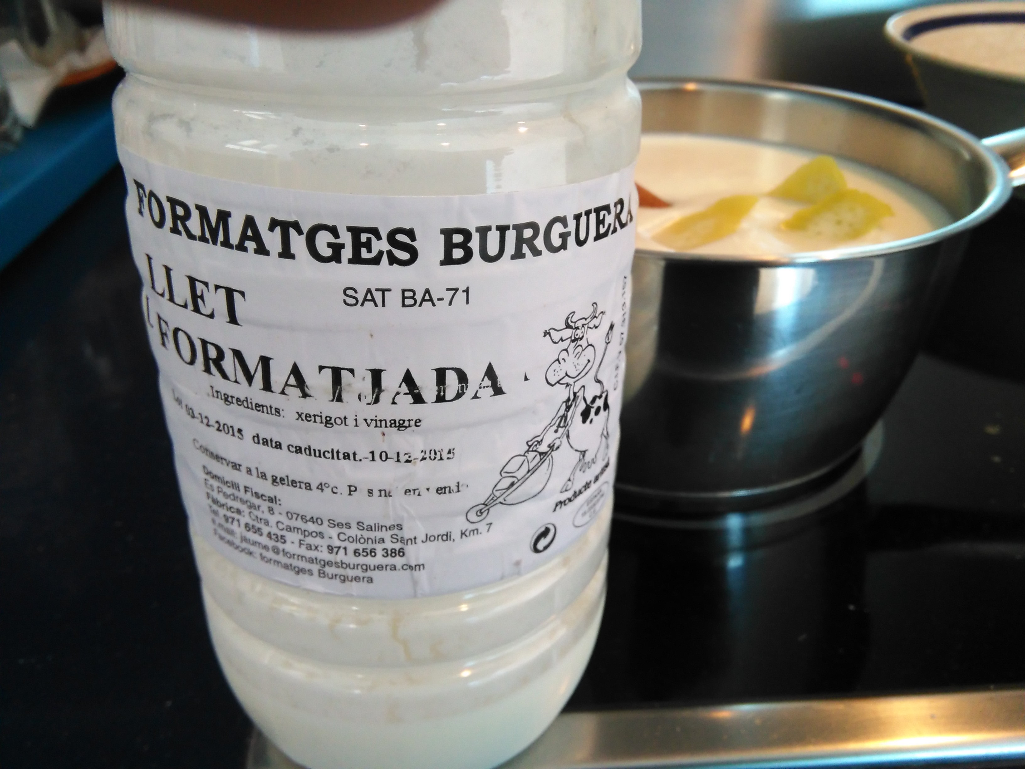 Esta leche solo se elabora esta temporada, supongo que por la calidad de los pastos y por consiguiente de la leche, otra vez cocina tradicional y además producto local, de cercanía... y además la premisa de aprovechamiento total, del suero lácteo del queso aún se aprovecha. Se pone al fuego la llet formatjada aunque nunca debe llegar al punto de ebullición, se aromatiza con canela y piel de limón. Unos 10 minutos sin dejar de remover para que no se pegue ni llegue a hervir.