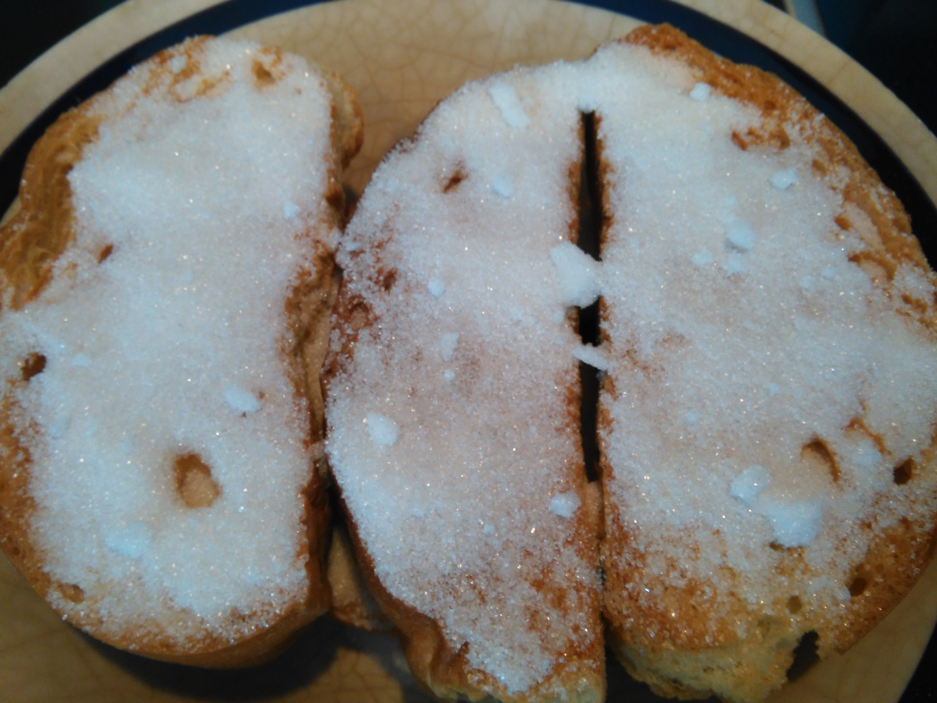Por otra parte, en una fuente se pone alguna elaboración dulce que ya esté dura, o más bien que no sea del día, en este caso suelen ser unas "cocas" dulces llamadas cocs, no he probado con ensaïmada pero debe de estar buena y también se utiliza el "bescuit" (quiere decir cocido dos veces" o "barros" que son estos cocs, estas elaboraciones dulces que una vez duras se cortaban en rebanadas y se volvían a hornear quedando así con una textura muy crujiente; estas elaboraciones dulces, duras, semiduras, crujientes... absorben muy bien el líquido de la llet formatjada. Encima de estas elaboraciones dulces se pone azúcar, también se puede añadir a la leche cuando se aromatiza con la canela y las pieles de limón. Otra vez aprovechamiento total.