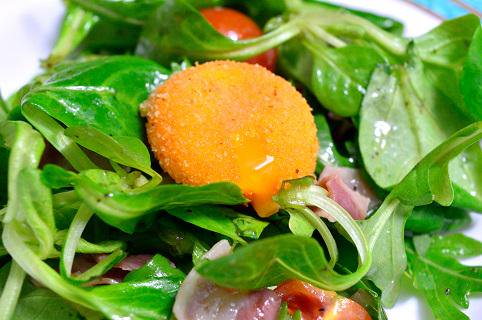 La yema se "cura" en pan rallado (en el frigorífico). Se saca con cuidado y se fríe sumergido en aceite apenas unos segundos. Se "sella" el pan rallado y dentro queda una explosión de yema :-)