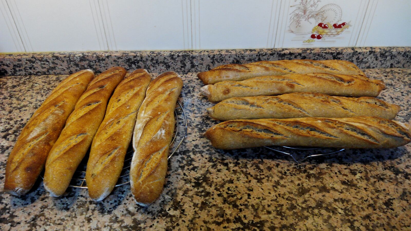 Las de la derecha con moldes de baguette (las primeras que cocí) y la suela del pan crudísima, tuve que acabar de hornearlas al revés... Y eso que las puse casi tocando el suelo del horno...