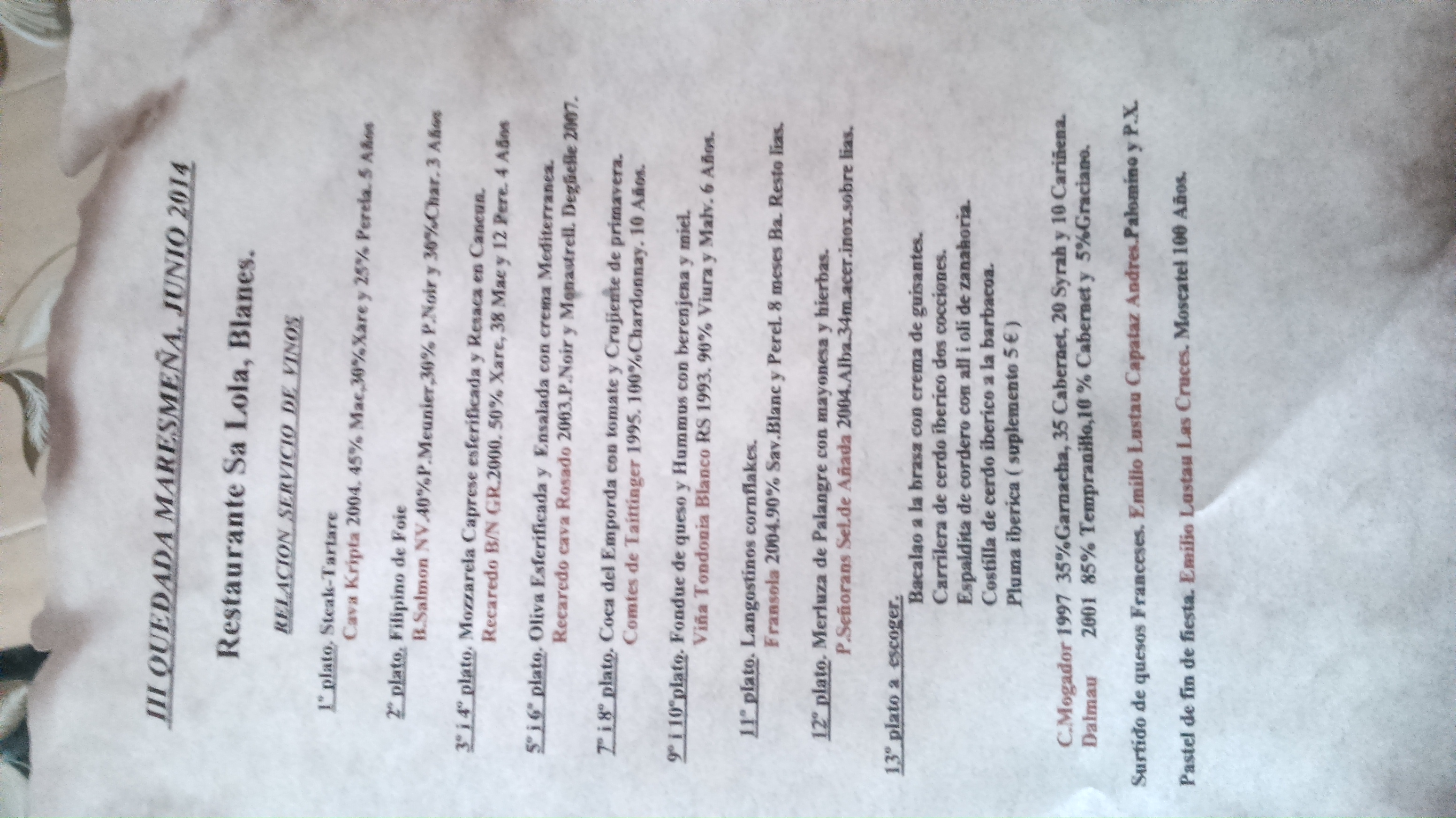 Ver mensaje de Obiwan FerranPuedes traer espumoso o blanco,para la carne no estaria mal pedirlo de la carta,tienen el Trossos