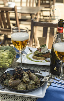 La intencion de estos restaurantes, es ofrecer menus con estos productos, con una cocina elaborada y precios, creo, muy contenidos (entre los 20 y 27 euros con bebida incluida). La bebida, tambien es "local", ya que tenemos la fabrica de DAMM, y la apuesta es con la Inedit, dicen los expertos la beboda que mejor marida con la alcachofa.