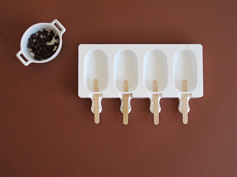Una vez tengamos el molde, añadimos la mezcla en los compartimentos, sin olvidar introducir en este los palitos individuales, ya que sin ellos será complicado conseguir que parezcan un polo y sostener el helado.